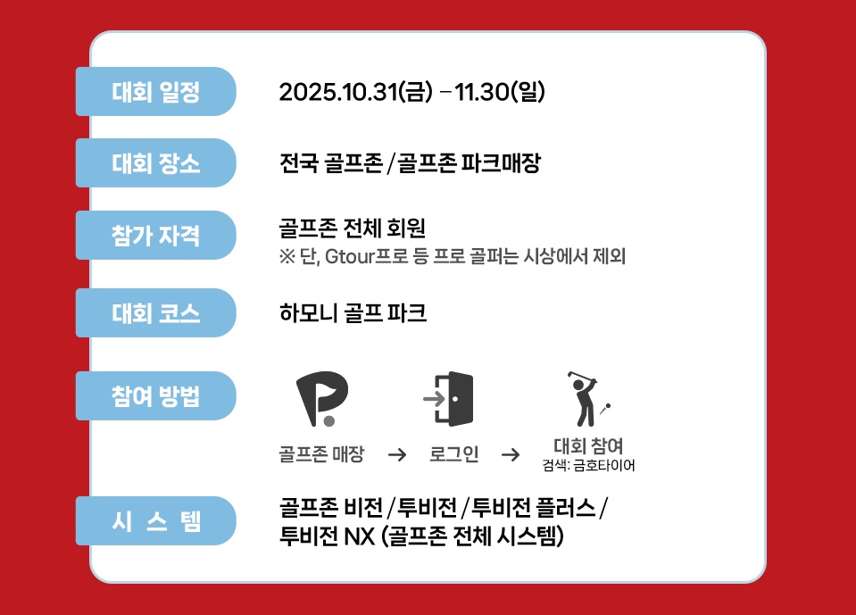 골프존 매장 → 로그인 → 대회 참여 (검색 : 금호타이어)